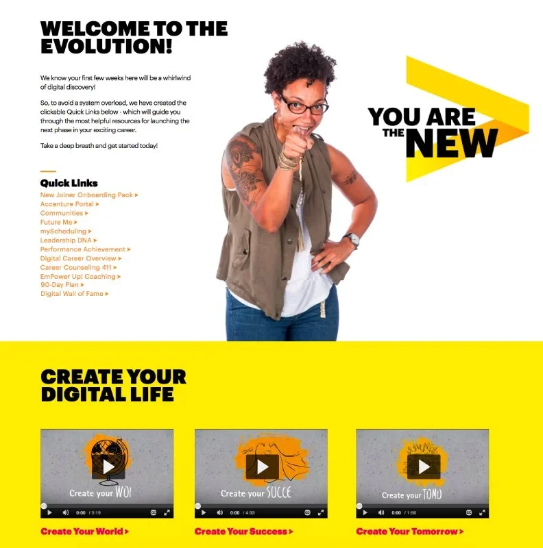 Designed and built the Accenture Digital New-Hire Hub, a one-stop intranet with resources, tools, and guidance for navigating the organization